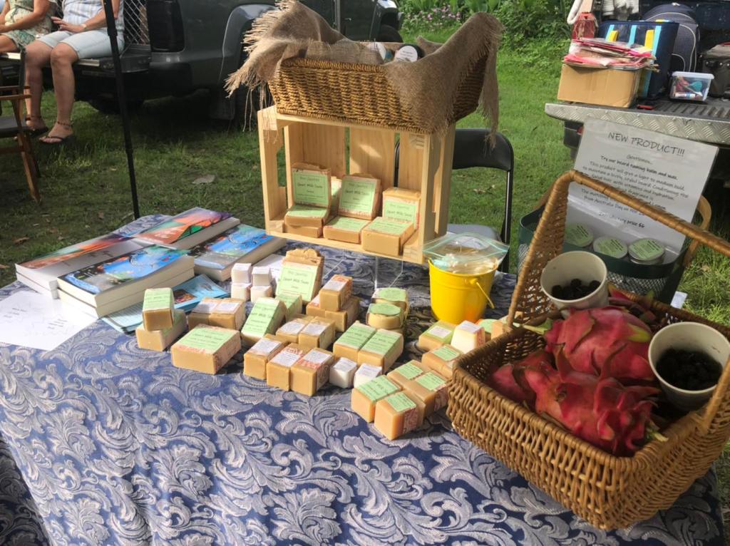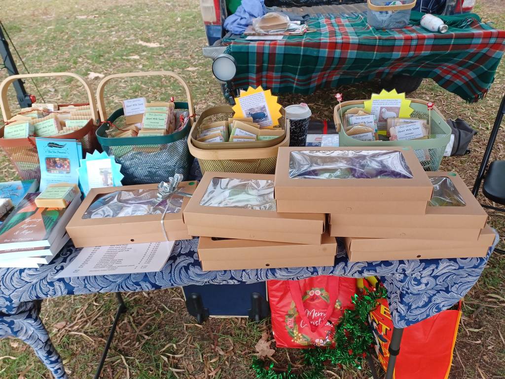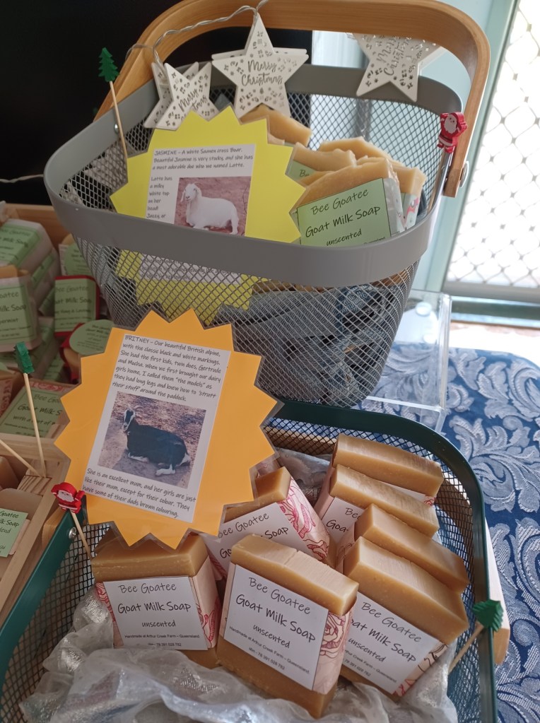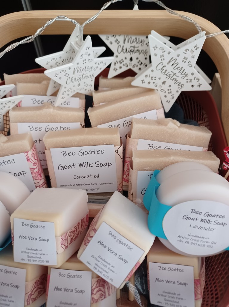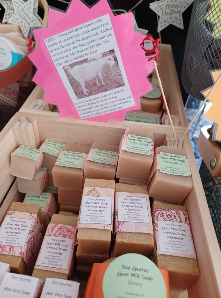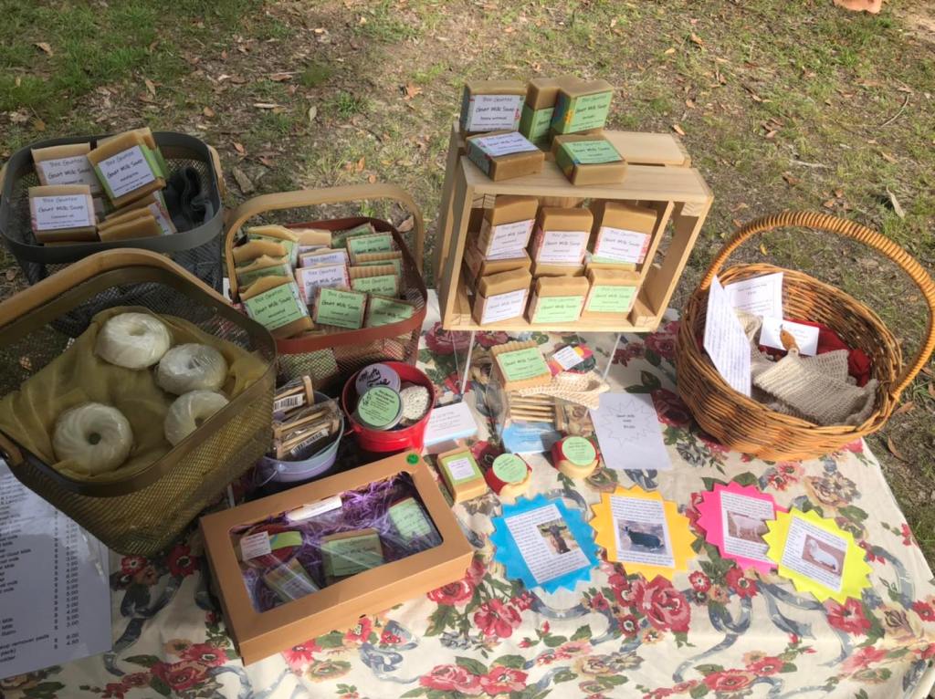 We love our goats! This is Jason with Rosemary’s triplets. They were an Easter Sunday surprise 2023, born around 6am. They were the first kids born on the farm. We have had many more kids arrive from August 2023 and Marion started milking. Gathering the deliciously creamy milk and adding it to the soap mix to produce a nourishing soap that is boosted with natural vitamins and minerals. Some people love it as it soothes the skin and can help with skin irritations such as eczema. Visit our square shop for the pricing and availability of our products. Below are some photos of our handmade soaps. Including our market stalls.